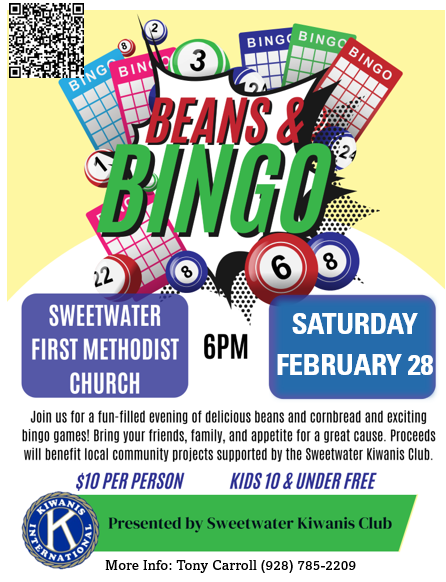 The Kiwanis Annual Beans & Bingo will be held on Saturday, Feb 28 at 6pm at the First Methodist Church Sweetwater. If you love beans, cornbread and bingo, then this is your place to be!